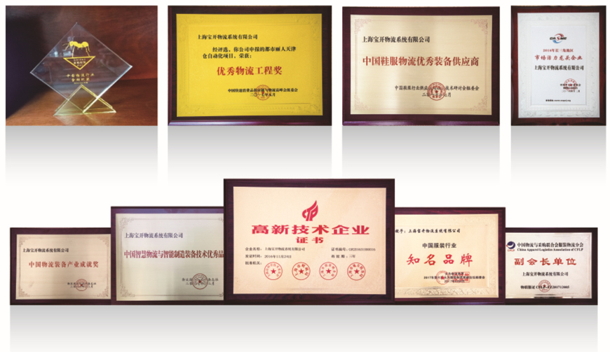 作為上海市高新技術企業、ISO認證企業、雙軟認證企業 ,寶開多項核心技術已獲得國家專利,同時,寶開是中國物流與采購聯合會服裝物流分會副會長單位,中國倉儲配送協會家居物流分會會員單位,《物流技術與應用》雜志理事單位,榮獲“2016年長三角地區市場活力龍頭企業”、“2016-2017年度中國物流行業金螞蟻獎”、“全國發明金獎”(AS/RS立體倉庫系統在紡織行業的應用)、“2018致敬改革開放中國鞋服供應鏈與物流優秀集成商”、“2018中國制造業優秀物流工程獎”、“2019鞋服供應鏈與物流優秀供應商”、“2019物流裝備產業產品技術創新獎”、2020年吳涇地區“創新活力獎”等多項榮譽。